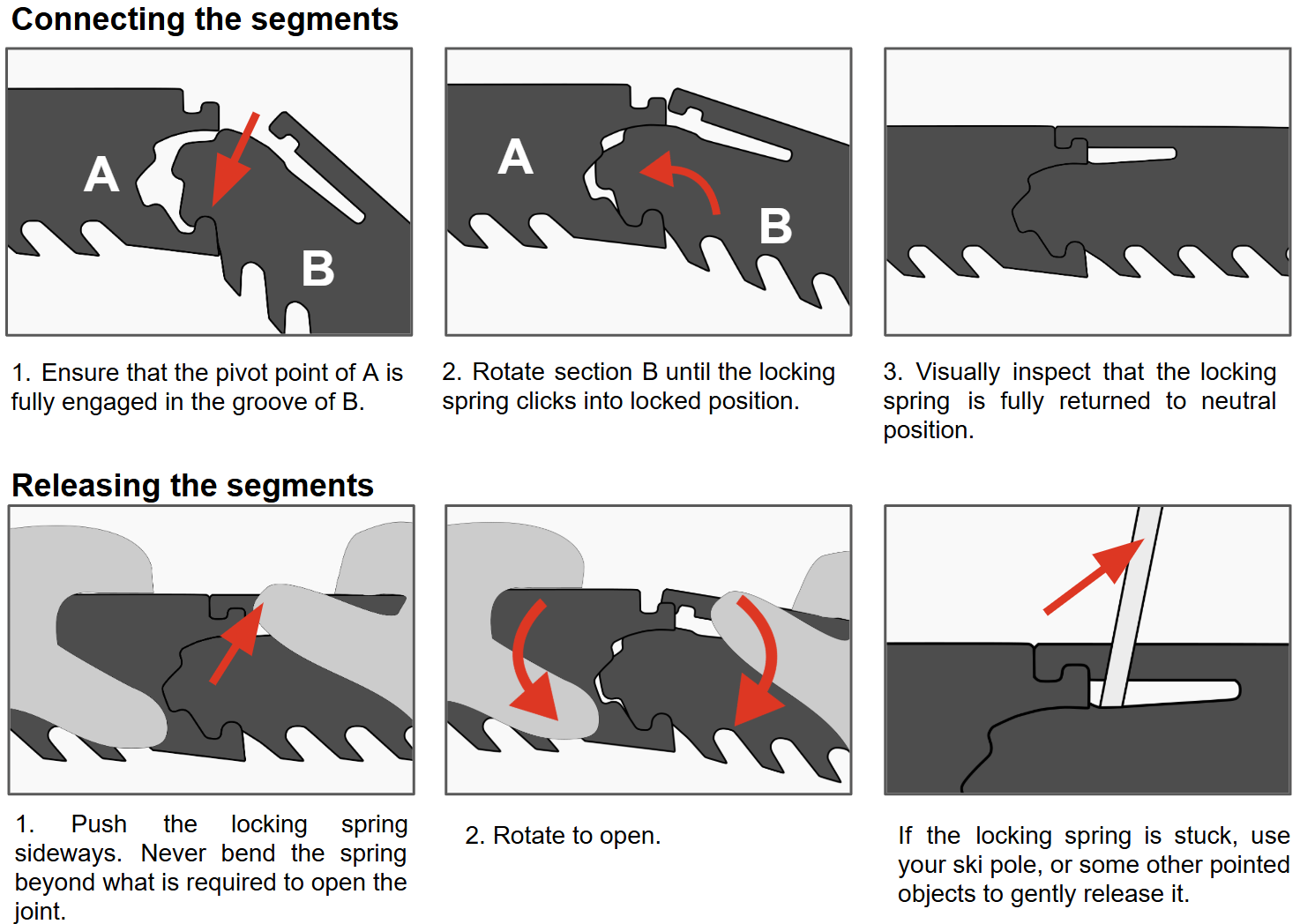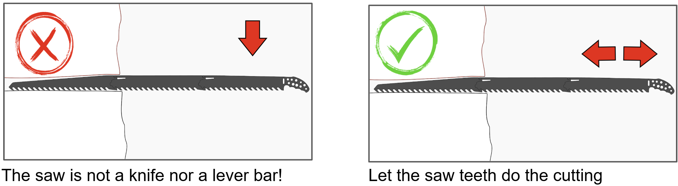 The product is designed to withstand the expected load generated from sawing snow. The product might break if the load limit is exceeded, or if it is misused or not properly maintained. This user instruction explains some of the correct and incorrect ways to use the saw. Remember that there are more incorrect ways to use the equipment than what is shown here. Seek qualified instruction if you are unsure of how to use this equipment.